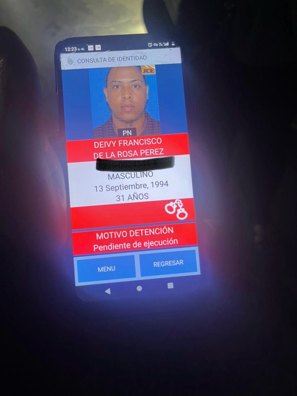 El primero de los detenidos es Deivy Francisco de la Rosa Pérez, dominicano de 31 años, quien fue capturado en un operativo ejecutado en la avenida España, frente al negocio de comida Solo Pollo. Tras ser depurado en el sistema de la Policía Nacional, se confirmó que mantenía una alerta roja pendiente de ejecución, correspondiente a la orden de arresto No. 04996-2022, emitida por un caso de violencia intrafamiliar en violación al artículo 309-2 de la Ley 24-97 del Código Penal, fechado el 7 de diciembre de 2022.