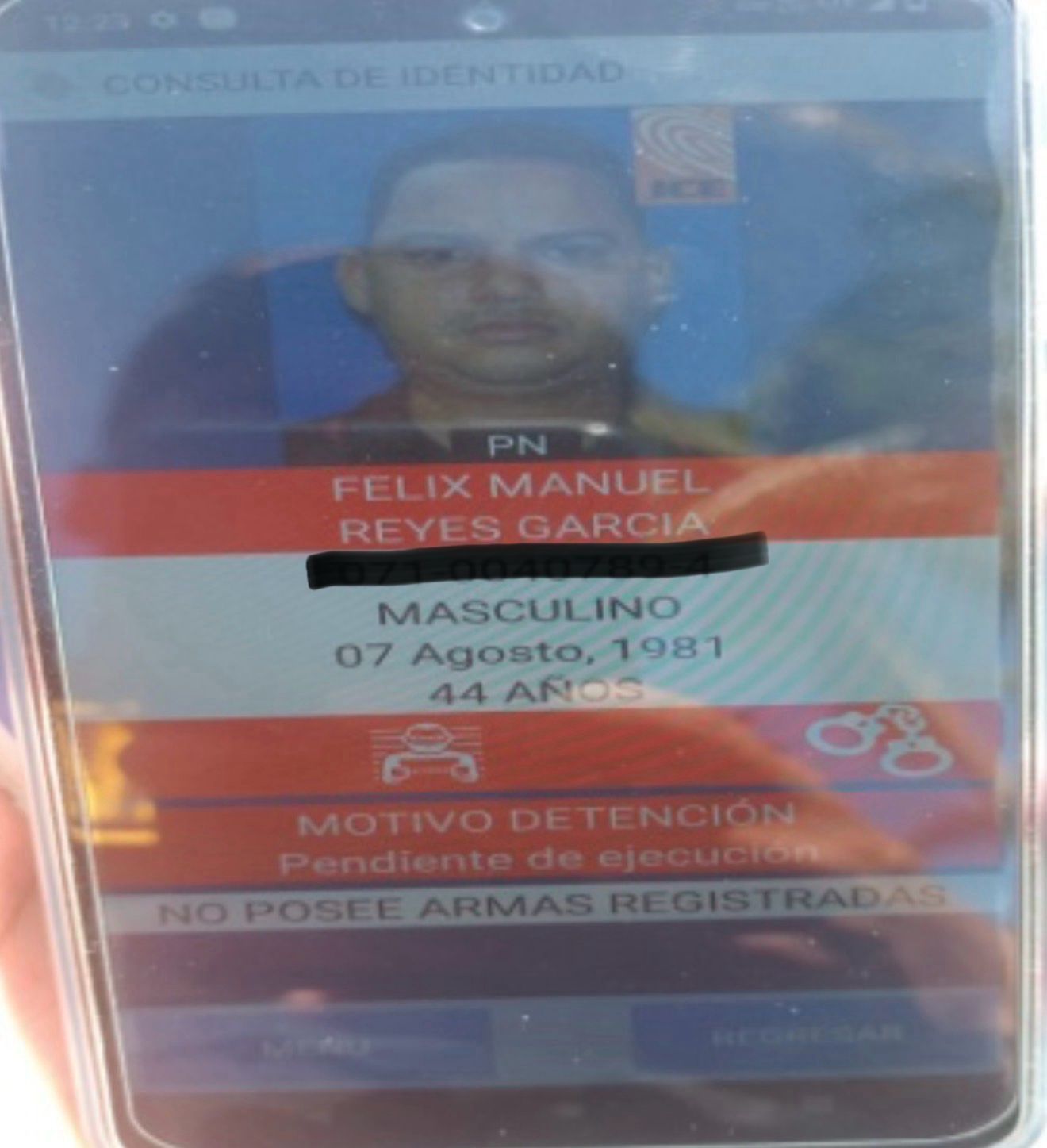 Al ser depurado en la plataforma de flota inteligente, Reyes García figuró con una alerta de captura por condición de prófugo, en cumplimiento de la orden de arresto No. 602-2017-EORJ-940, de fecha 11 de agosto de 2017, por violación al artículo 408 del Código Penal dominicano, en perjuicio del ciudadano Pablo de Jesús Jesus Ortega.