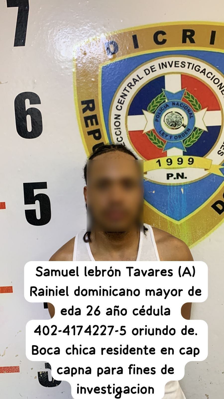 El tercer detenido es Samuel Lebrón Tavares (Rainiel), de 26 años, apresado por la orden No. 05027-2025 emitida por la magistrada Francis Y. Reyes Dilone, por violación al artículo 309 del Código Penal, relativo a golpes y heridas.