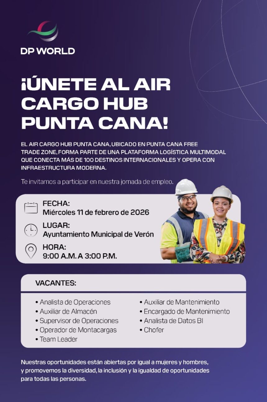 Verón–Punta Cana.– DP World anunció la realización de una jornada de empleo para el Air Cargo Hub Punta Cana, ubicado en la Punta Cana Free Trade Zone, una moderna plataforma logística multimodal que conecta con más de 100 destinos internacionales.