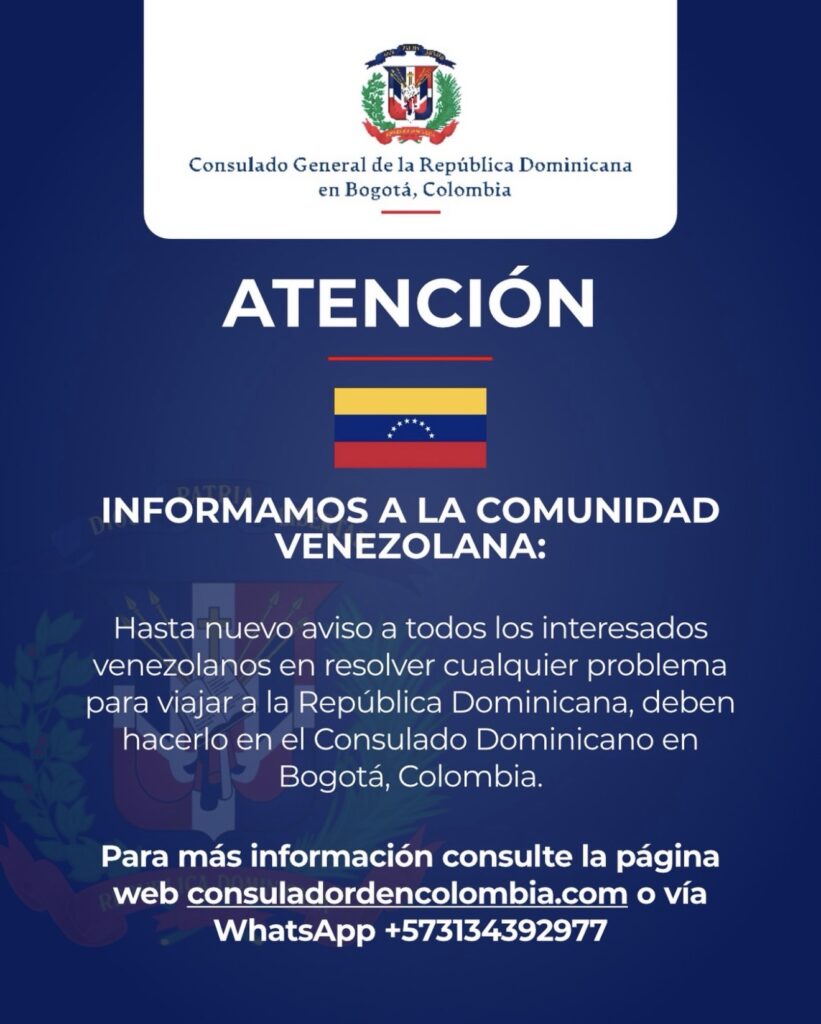 El Consulado General de la República Dominicana en Bogotá, Colombia, emitió un aviso dirigido a la comunidad venezolana interesada en viajar al país, informando que, hasta nuevo aviso, todos los procesos y gestiones deberán realizarse exclusivamente a través de esa sede consular.
