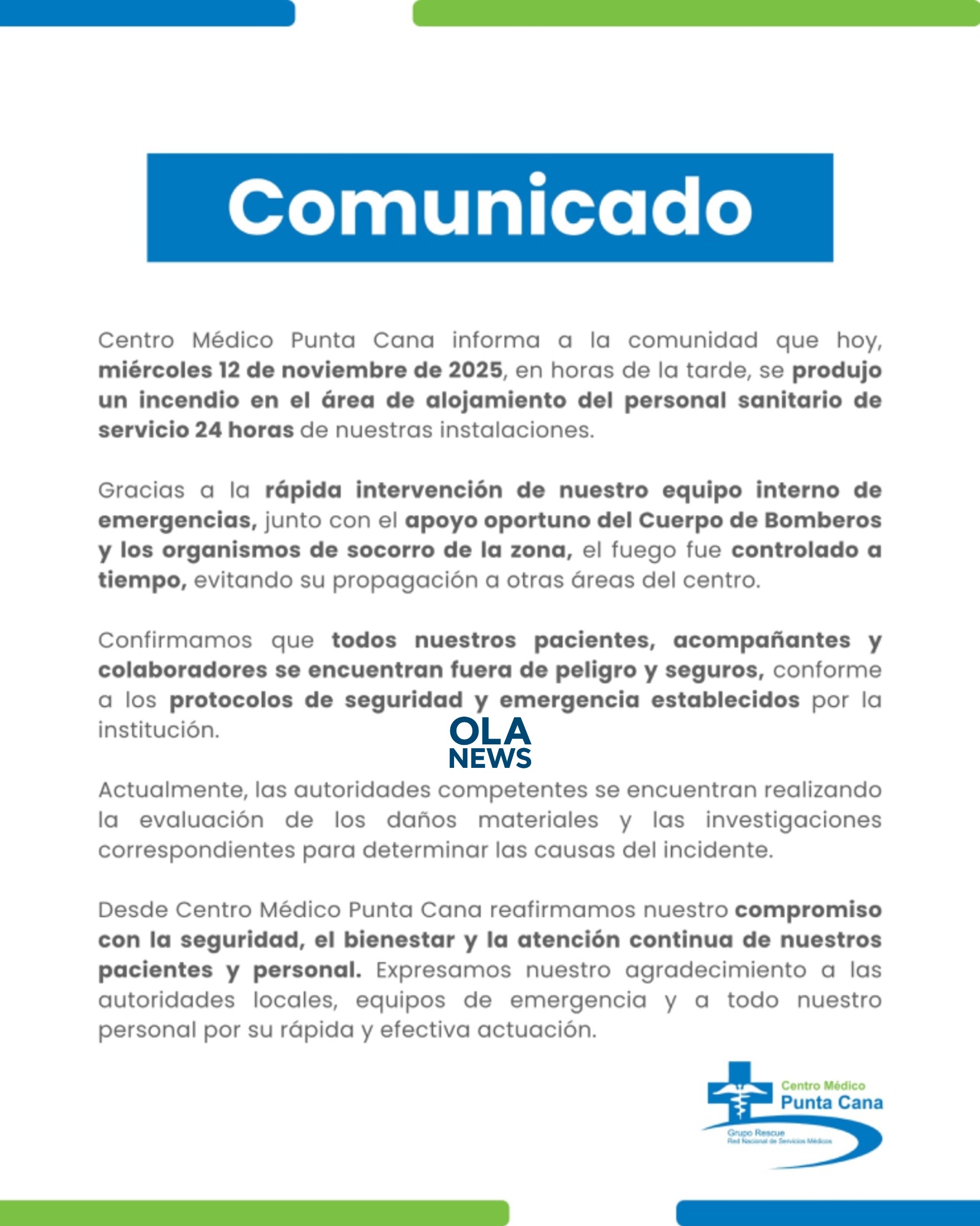 El Centro Médico Punta Cana reiteró su compromiso con la seguridad, el bienestar y la atención continua de sus pacientes, agradeciendo el trabajo conjunto de los equipos de emergencia, las autoridades locales y su personal ante la situación.