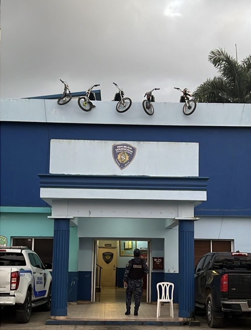 Miches, El Seibo.- Varias motocicletas incautadas durante operativos policiales en Miches han llamado la atención de la ciudadanía al ser colocadas en el techo del destacamento, como parte de las acciones contra la conducción temeraria en la zona.