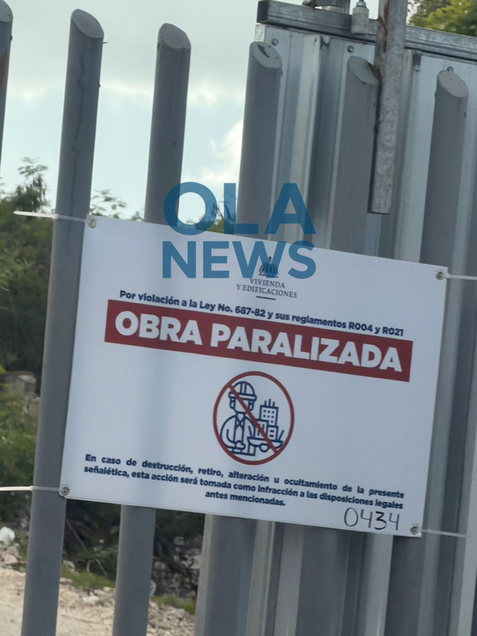 En el lugar se observó un letrero oficial que notifica la suspensión de los trabajos por “violación a la Ley No. 687-82 y sus reglamentos RO04 y ROZ1”, normativa que regula las condiciones de construcción y el control de edificaciones en el país.
