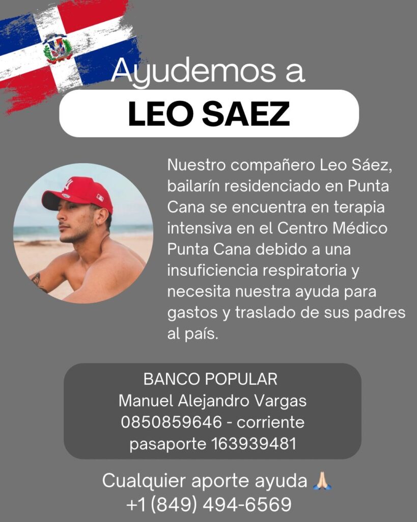 Punta Cana.– Amigos, colegas y miembros de la comunidad artística solicitan ayuda solidaria para Leo Sáez, bailarín argentino residenciado en Punta Cana, quien actualmente se encuentra ingresado en la unidad de cuidados intensivos del Centro Médico Punta Cana, tras presentar una insuficiencia respiratoria.