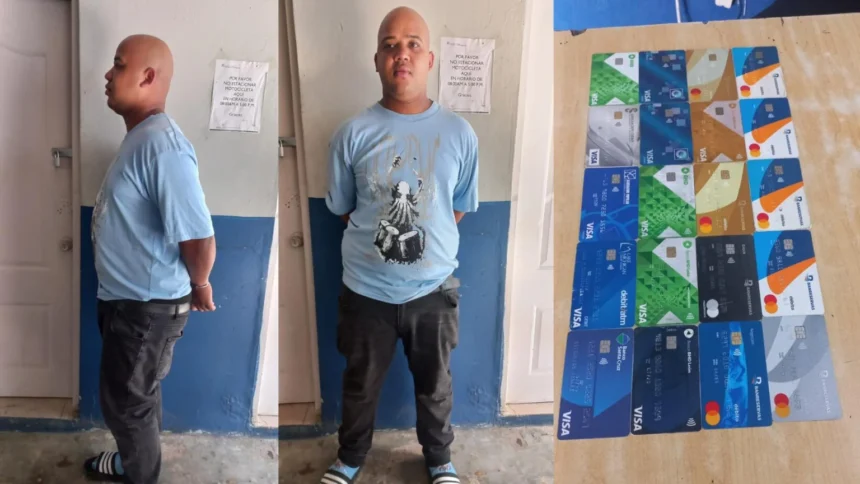 Villa Altagracia R.D.– Un operativo policial en la calle Duarte de este municipio terminó con la captura en flagrante delito de Roberto Antonio Araujo, de 28 años, residente en Los Alcarrizos, señalado como presunto estafador y portador de 20 tarjetas de diferentes entidades financieras.