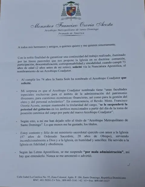 La Santa Sede decidió limitar las funciones del arzobispo de Santo Domingo, Francisco Ozoria Acosta, tras atribuirle presunta mala administración, dejándolo únicamente con el título simbólico de arzobispo.