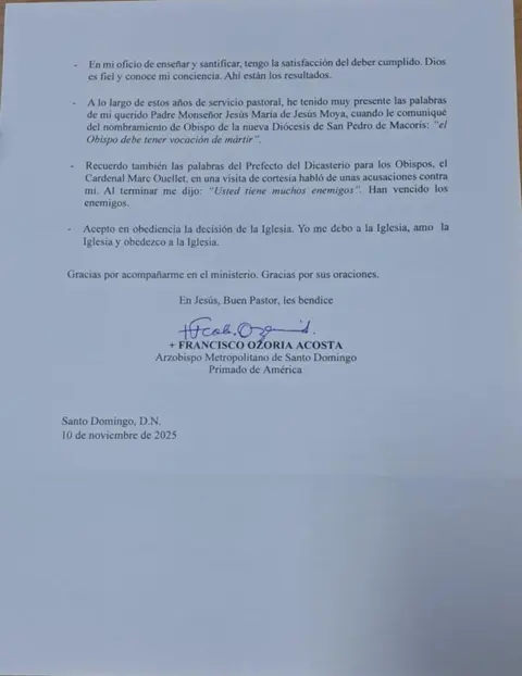 El prelado reconoció que, según las Letras Apostólicas, su suspensión se debe a mala administración y señaló que nunca recibió advertencias previas. Aun así, afirmó sentirse en paz con su servicio a la Iglesia durante más de cuarenta años.