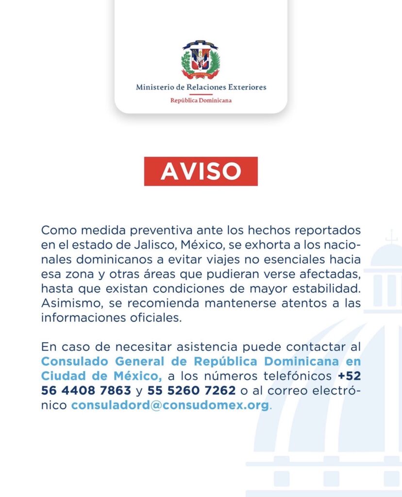 El Ministerio de Relaciones Exteriores (MIREX) emitió un comunicado en el que exhorta a los ciudadanos dominicanos a evitar viajes no esenciales hacia el estado de Jalisco, en México, como medida preventiva ante los hechos violentos reportados en esa zona.