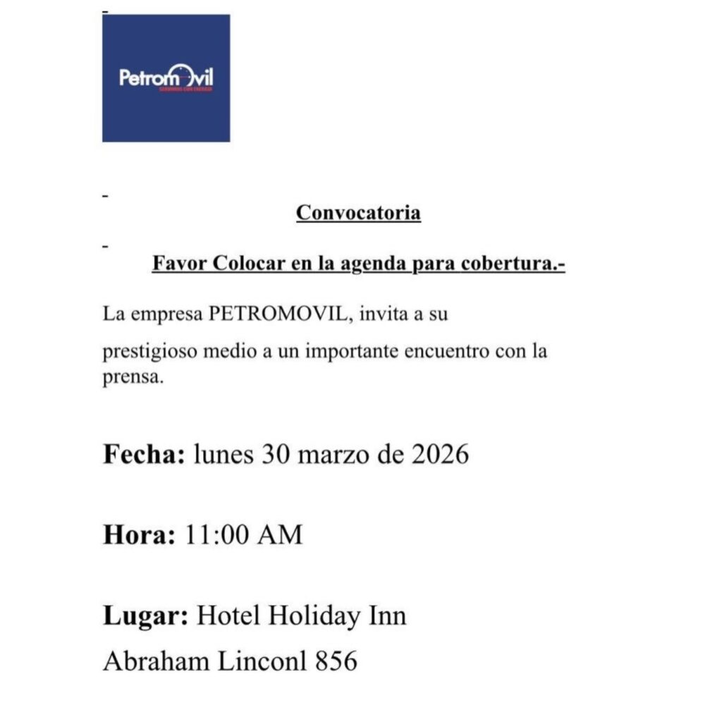 Santo Domingo.- La empresa PETROMOVIL anunció la realización de un encuentro con la prensa este lunes 30 de marzo de 2026, en el que compartirá informaciones relevantes sobre su situación actual.