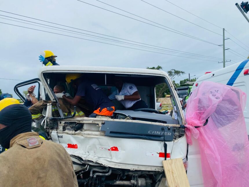 Verón-Punta Cana.– Un accidente de tránsito entre dos camiones ocurrido la tarde de este lunes en la Circunvalación de Verón, próximo al semáforo de la zona, dejó una persona atrapada dentro de uno de los vehículos, siendo rescatada por el Cuerpo de Bomberos de Verón–Punta Cana–Bávaro.