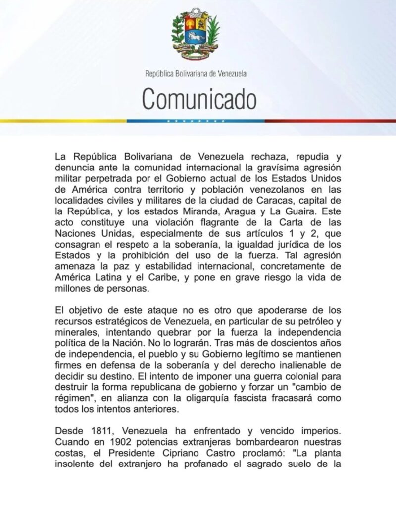Frente a esto, el régimen de Maduro afirmó que este hecho «constituye una violación flagrante de la Carta de las Naciones Unidas» y aseguró que el propósito del ataque «no es otro que apoderarse de los recursos estratégicos de Venezuela».