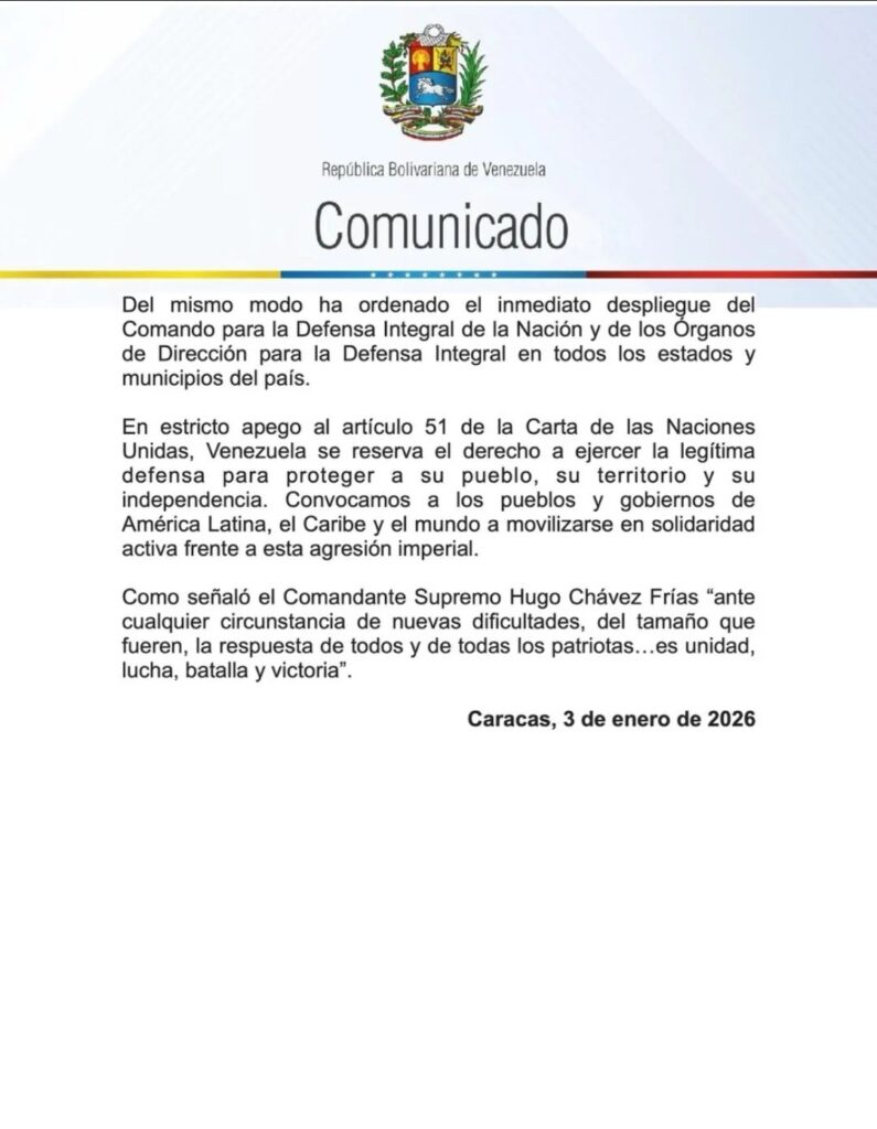 «El Presidente Nicolás Maduro ha firmado y ordenando la implementación del Decreto que declara el estado de Conmoción Exterior en todo el territorio nacional, para proteger los derechos de la población, el funcionamiento pleno de las instituciones republicanas y pasar de inmediato a la lucha armada. Todo el país debe activarse para derrotar esta agresión imperialista», dice el comunicado.