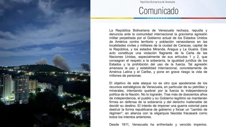 Tras los reportes de varias explosiones en distintas ciudades de Venezuela, el régimen de Nicolás Maduro emitió un comunicado en el que confirmó los bombardeos por parte de Estados Unidos. El gobierno venezolano calificó los ataques como una “gravísima agresión militar” y declaró el estado de Conmoción Exterior en todo el país.