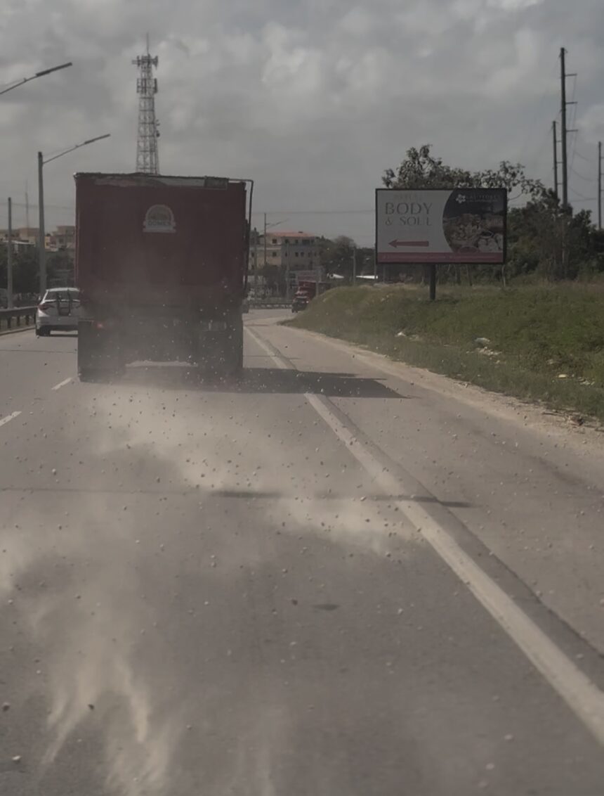 Bávaro, Punta Cana.- En la tarde de este martes, un camión cargado de caliche, perteneciente a la empresa Domes, puso en peligro a numerosos conductores que transitaban por el Boulevard Turístico del Este, tras ir derramando material durante su recorrido.