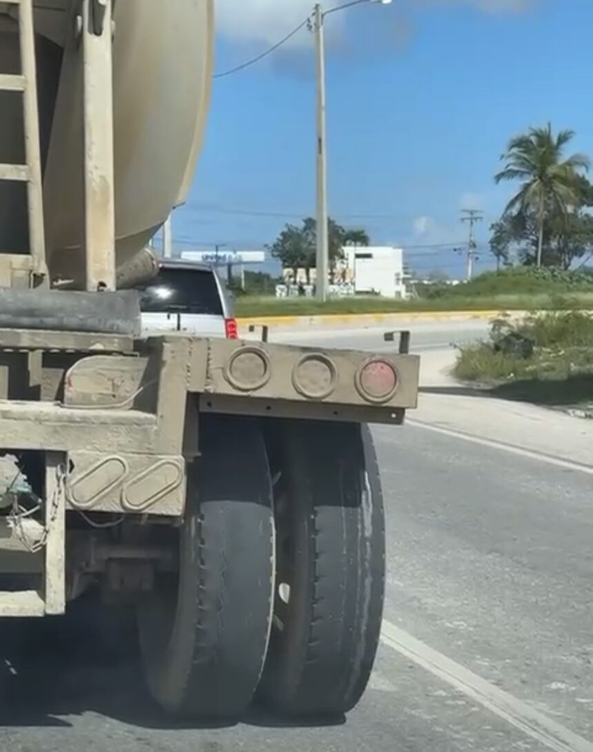 El camión transita por el Bulevar Turístico del Este sin placa además, y no se identifica la compañía propietaria del vehículo.
